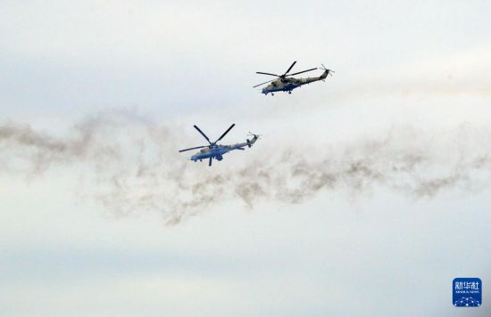 这是9月15日在白俄罗斯明斯克州拍摄的俄白“西部-2025”联合战略演习现场的直升机。新华社发(任科夫摄)