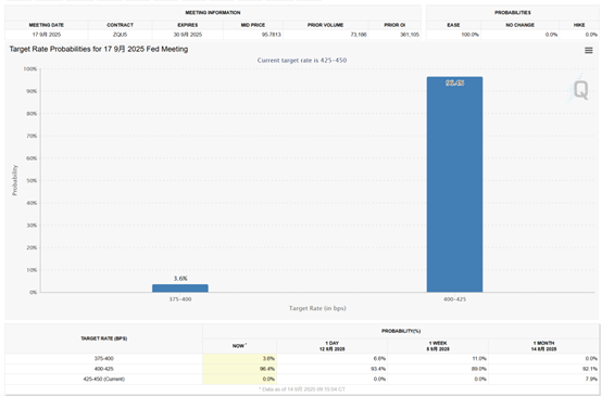 美国联邦基金利率目标区间现为4.25%-4.50%。特朗普多次表示美国利率至少偏高300个基点,应降至1%左右。虽然特朗普声称美联储将大幅降息,但目前来看,本周降息50个基点的可能性不大。据CME“美联储观察”,降息25个基点的概率达96.4%,降息50个基点的概率仅为3.6%。若美联储一下子降息50个基点,可能会引发市场恐慌,这不是特朗普所希望看到的情况。