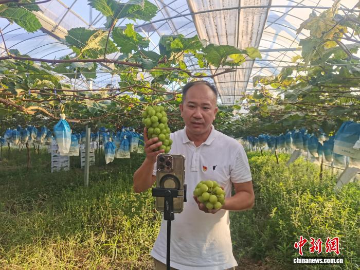中新网绍兴9月18日电 (张益聪 徐杭惠)“今天我们直播间近距离看一看绿色防虫、不打农药的有机葡萄,让大家吃得放心。”近日,在浙江省绍兴市上虞区叶氏兄弟丁宅阳光玫瑰基地,虞南乡亲、网络达人俞荣军开启了手机直播,通过直播链接,上虞的四季果蔬销往各大城市的同时,为当地农民增收致富。