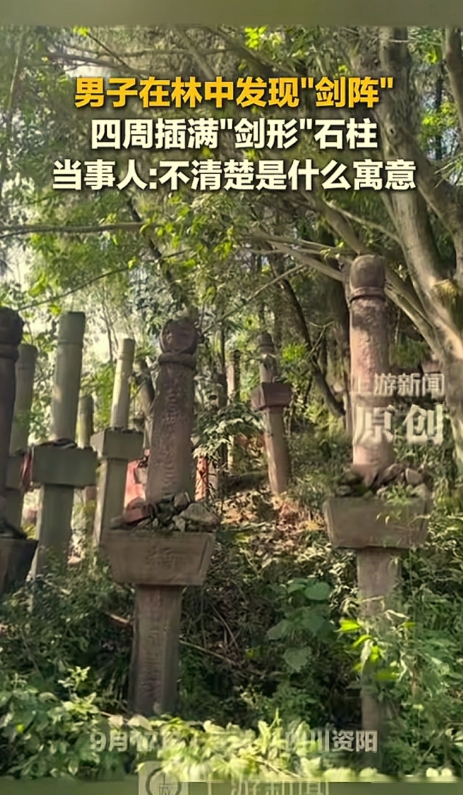 四川一男子在林中发现“剑阵”。“万万没想到!”四川资阳,男子去山上游玩,本以为是一片荒山,不料,他竟然直接愣在了原地,不是因为发现了宝贝,而是被眼前成片的“石头剑阵”吸引住了,男子傻眼了,看了半天也不愿意离开。以前看过的武侠剧和小说,男主受伤躲进荒山里,突然发现不为人知的石头阵,是不是就属于这种?有网友兴奋道:是不是剑派宗门被你发现了?起初男子以为这山上只有两座旧庙,直到往里面走眼前突然出现一片片高大的石头剑阵群,堪称鬼斧神工。男子简直不敢相信自己的眼睛,可事实就摆在眼前,他以前也来过这座山,怎么就没发现呢?视频中,这些石头剑,剑柄朝上,虽然高矮不一,但是剑尖都深埋在地下,剑身上还刻着复杂的花纹,足足有上百个,仿佛时刻在等待召唤,拔地而起。这形状显然是人为制作的,一眼看上去,年头久远,至于什么时候出现的,男子也说不清。但他觉得这次没白来,能发现这样的奇观太值了!有网友说:剑仙传承有缘人,兄弟上前挑一把摸摸看!这地方确实神奇,大家猜猜,这些石头剑到底是怎么形成的?你觉得是应该把这些老物件保护起来,还是开发旅游,拍照打卡呢?