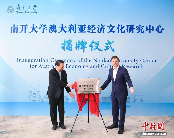 9月21日,南开大学校长陈雨露(左)与澳大利亚墨尔本市市长尼古拉斯·里斯共同为“南开大学澳大利亚经济文化研究中心”揭牌。中新社记者 佟郁 摄