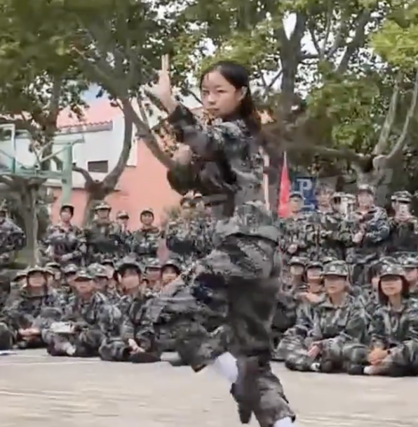 军训期间女生打出一套武当拳。9月26日,安徽某校军训期间一名女生表演武当拳,动作行云流水,飒爽英姿引发全场喝彩,视频经网络传播后获赞“青春最美的样子”。