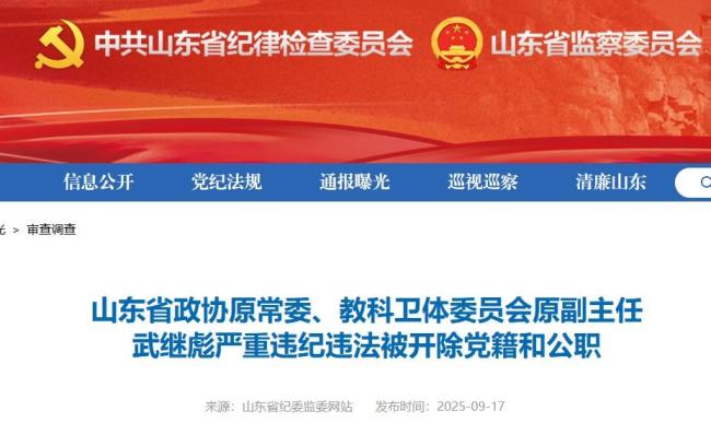 山东省政协原常委武继彪被双开!山东省纪委监委9月17日宣布,经山东省委批准,山东省纪委监委对山东省政协原常委、教科卫体委员会原副主任武继彪的严重违纪违法问题进行了立案审查调查。调查显示,武继彪丧失理想信念,背弃初心使命,对党不忠诚不老实,对抗组织审查;无视中央八项规定精神,违规收受礼品、礼金、消费卡,接受可能影响公正执行公务的旅游安排;违反组织原则,在组织函询时不如实说明问题,违规为他人在职务晋升、职工录用等方面谋取利益;廉洁底线失守,利用职权为特定关系人经营活动谋取利益;违反生活纪律,不重视家风建设;公器私用,以权谋私,利用职务便利为他人在项目承揽、药品采购等方面谋利,并非法收受巨额财物。