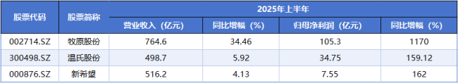 2025年上半年,牧原股份实现营收764.6亿元,同比增长34.46%;归母净利润为105.3亿元,同比大幅增长约1170%。牧原股份表示,今年上半年公司生产成绩持续改善,生猪养殖成本逐月下降,2025年6月生猪养殖完全成本低于12.1元/kg。同时,牧原股份加强了屠宰与养殖的业务协同效应,通过屠宰业务了解各地市场需求,提升养殖端的育种工作及生产管理。