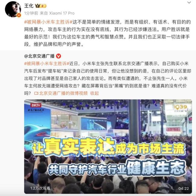 小米王化称攻击车主的行为没有底线 网络暴力需严惩。