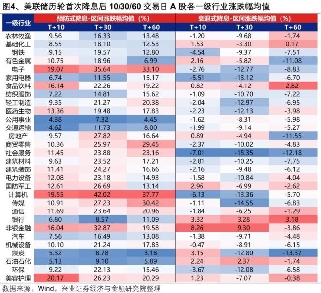 美元贬值,国际资本从美国流向高增长的新兴市场寻求更高回报,A股将受益于流动性宽松和风险偏好提振上涨,科技板块以及食品饮料、社会服务、美容护理、医药生物等消费核心资产占优;衰退式降息后,受全球经济衰退影响调整,行业层面非银、银行等金融板块以及石化、化工等周期板块为代表的防御类资产占优。