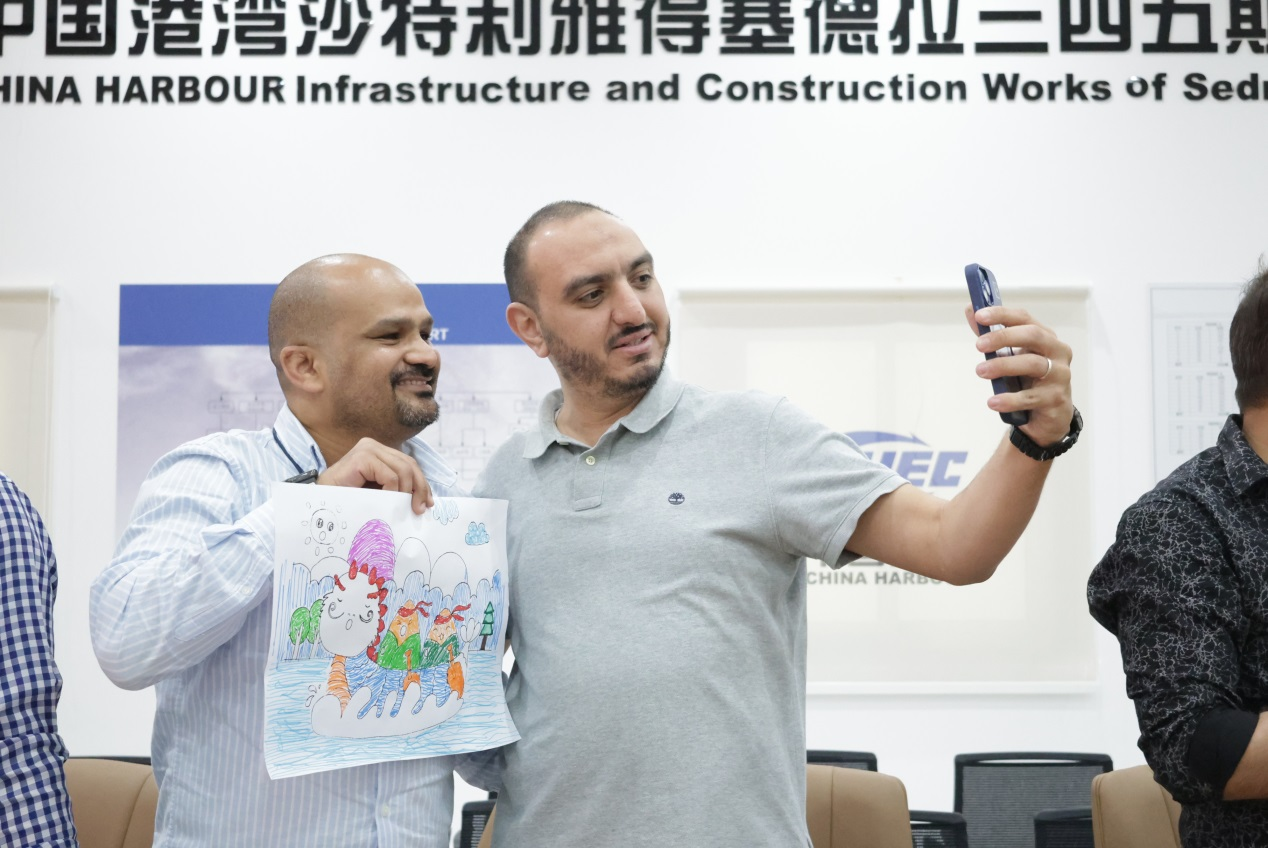 外籍员工展示自己完成的涂彩画作品。中国港湾沙特塞德拉项目供图