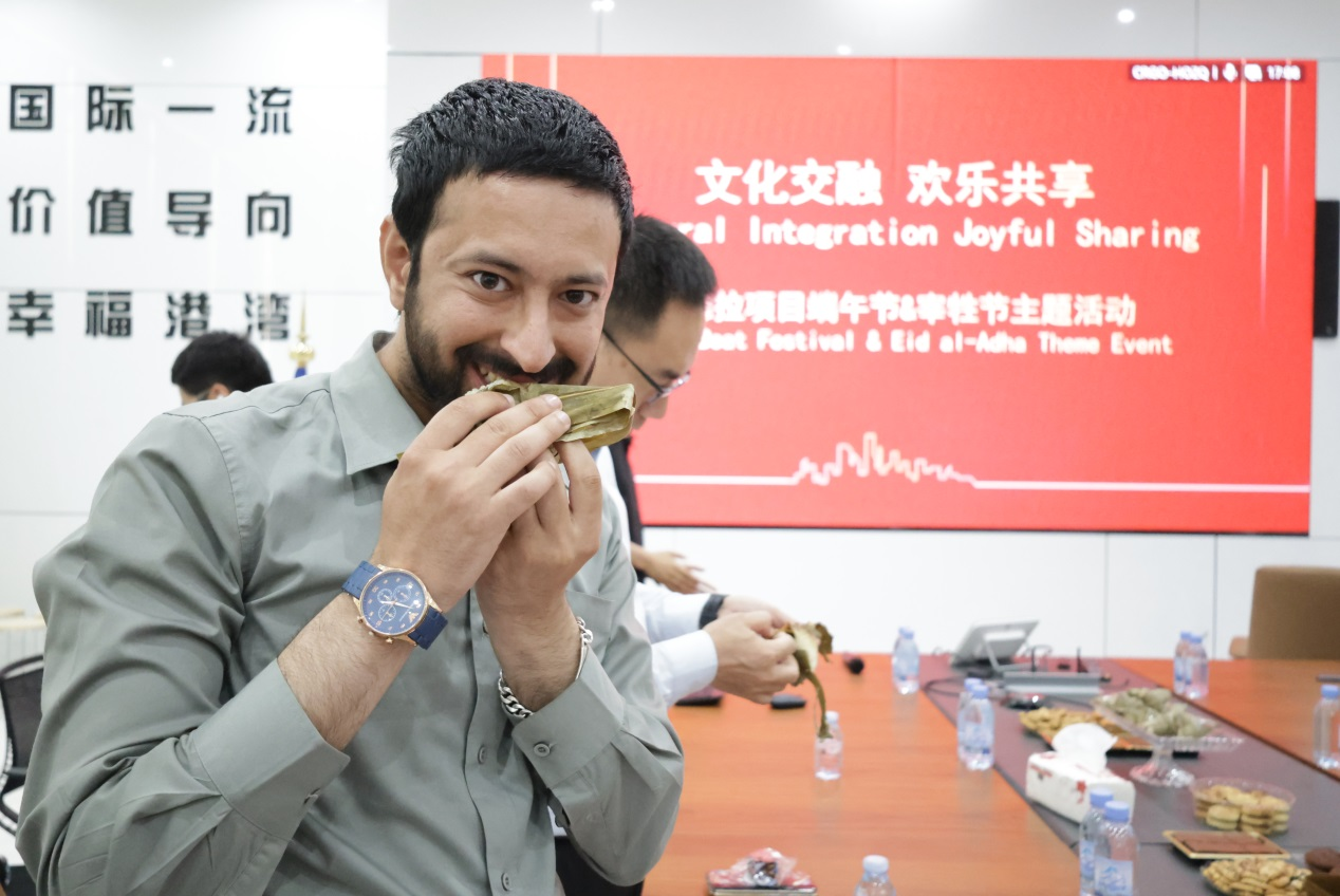 外籍员工品尝粽子。中国港湾沙特塞德拉项目供图