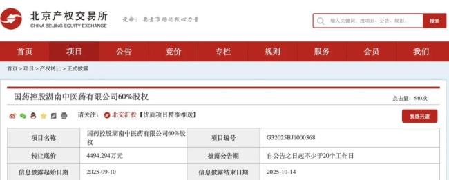 9月10日,北京产权交易所披露一则消息,国药控股湖南有限公司(简称“国控湖南”)计划以4494万元底价,转让其持有的国药控股湖南中医药有限公司(简称“国控湖南中医药”)。