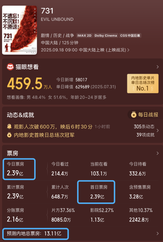 上映不到12小时,电影《731》已连续打破多项市场纪录。