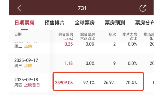 除票房表现外,《731》在排片方面同样显示出压倒性优势,今日排片占比高达70%,票房占比更是达到97%。这意味着今日电影市场几乎全部票房收入均来自该片。