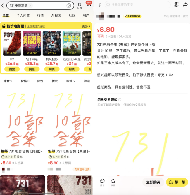 值得注意的是,今日电影《731》刚上映就遭遇了盗摄,蓝鲸记者在二手平台上发现大量出售电影资源的商家,标价8.8元。
