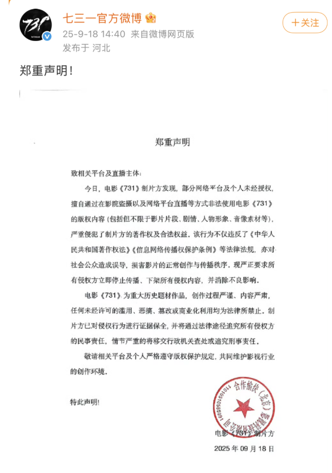 部分网络平台及个人未经授权,擅自通过在影院盗摄以及网络平台直播等方式非法使用电影《731》的版权内容(包括但不限于影片片段、剧情、人物形象、音像素材等),严重侵犯了制片方的著作权及合法权益。