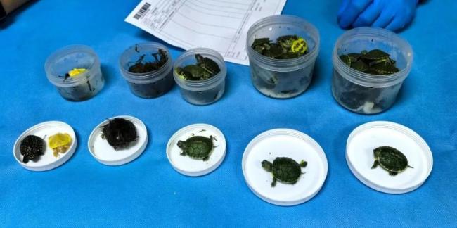 广州白云机场海关关员在对一票申报为“塑料马桶座圈套”的出境快件进行监管时,发现该快件内部填充了大量棉花,棉花包裹着5个圆柱形塑料盒,盒内均装有活体乌龟,共计52只。这些乌龟品种不一,颜色各异,主要以绿色乌龟为主,还有少量褐色和黄色乌龟。经技术机构鉴定,确认这些乌龟中包括彩龟48只、斑点池龟2只、麝香龟2只。斑点池龟和麝香龟均属于《濒危野生动植物种国际贸易公约》(CITES)附录列明的保护物种。