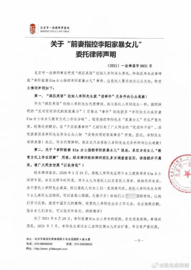 9月28日,李阳“家暴女儿”名誉侵权案代理律师周兆成在社交平台上宣布,李阳在一审中胜诉。周兆成表示,在经历了长达三年的“恶意诋毁”和“网络暴力围剿”后,疯狂英语创始人李阳终于在这起案件中取得了重大胜利。