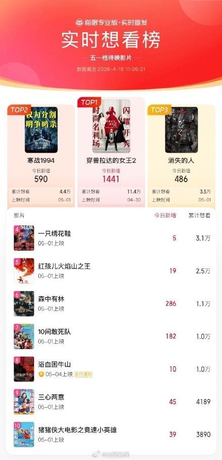2026年五一档期,已有18部影片定档。《穿普拉达的女王2》在猫眼想看榜上表现突出,累计想看人数超过11.4万,位居榜首。紧随其后的是《寒战1994》和《消失的人》。这些电影中,你最期待哪一部?可以在评论区分享你的看法。