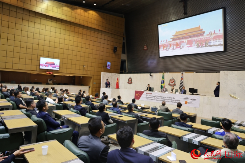 人民网圣保罗9月19日电 (记者时元皓)当地时间9月19日,纪念中国人民抗日战争暨世界反法西斯战争胜利80周年活动在巴西圣保罗州议会举办。活动由中国驻圣保罗总领馆、圣保罗州议会中巴友好小组联合主办,圣保罗侨界代表、驻巴中企代表、中巴两国友好人士等百余人出席纪念活动。